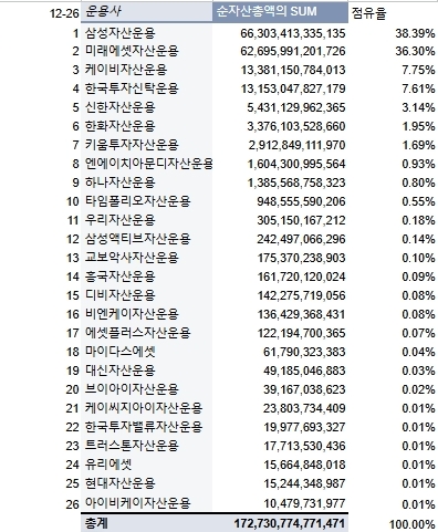 한편 4위인 한국투자신탁운용의 점유율은 지난해 말(4.89%) 대비 2.69%포인트 불어난 7.58%를 기록해 성장성이 돋보였다. 현재 3위인 케이비자산운용과의 점유율 차이는 근소한 차이로 좁혀졌다.
