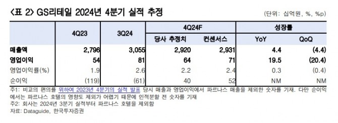 한국투자증권 김명주 연구원은 "지난 23일 인적분할 후 재상장한 GS리테일은 부진한 주가 흐름을 이어가고 있다"며 "밸류에이션 매력은 높아졌으나 시장 조정과 함께 유통 섹터로 우호적 수급 유입이 이뤄지지 못하는 점 등을 고려하면 주가 반등에 시간이 걸릴 것"이라고 전망했다. 4분기 실적에 대해서는 "프로모션비 등 비용 부담이 계속되면서 4분기 영업이익은 전년 동기 대비 감소할 것"이라고 덧붙였다.