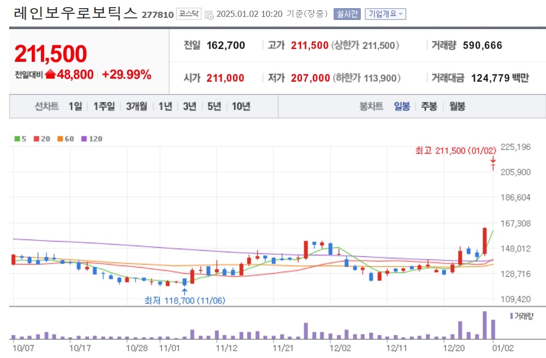 레인보우로보틱스는 지난 31일 15.23% 급등한 데 이어 이날 상한가까지 치솟았다. 급등세를 이어가고 있는 것이다.