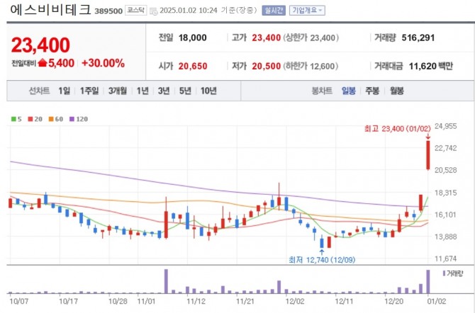 이미지 확대보기2일 한국거래소에 따르면 오전 10시 52분 현재 에스비비테크는 전일대비 30%나 급상승한 2만3400원을 기록하고 있다. 전일 종가는 1만8000원이었다.