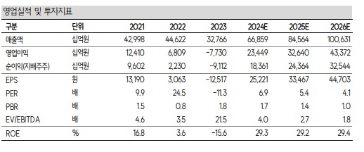 세트 수요 부진으로 낸드의 비트그로스(비트 단위로 환산한 생산량 증가율)는 증가하고, 평균판매단가(ASP)는 5% 감소했다. 믹스 제고의 핵심인 HBM 출하 확대로 디램의 비트그로스는 7% 늘었다. ASP도 9% 오르며 호조를 지속할 전망이다. 디램 내 HBM 매출액 비중은 40%를 기록할 것으로 보인다.
