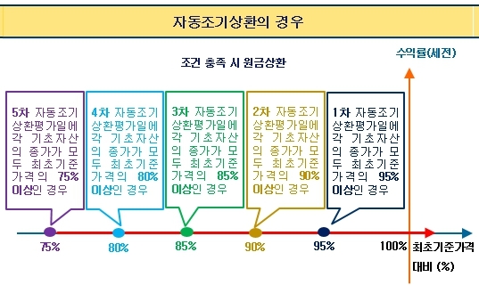 6개월마다 조기상환 평가일이 도래하며, 평가일에 모든 기초자산의 종가가 최초 기준가격의 95%(6개월), 90%(12개월), 85%(18개월), 80%(24개월), 75%(30개월) 이상이면 조기상환이 이뤄진다.