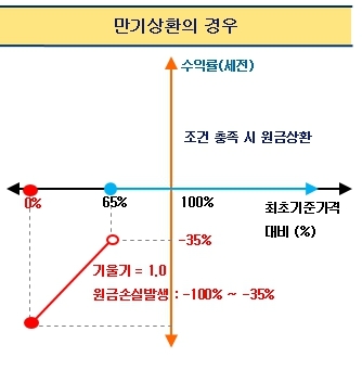 해당 ELS는 노 낙인(No knock-in) 구조로 만기평가일(36개월)에 모든 기초자산의 종가가 최초 기준가격의 65% 이상일 경우 원금상환 조건으로 만기상환되며, 하나라도 65% 미만으로 하락한다면 원금손실이 발생한다.