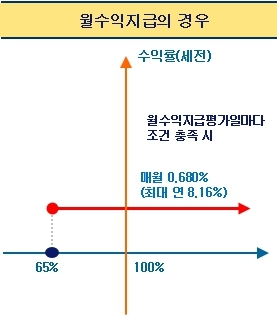 월지급식 구조이며, 매월 돌아오는 월수익지급 평가일에 모든 기초자산의 종가가 최초기준가격의 65% 이상이면 월 단위 세전 0.68%, 연간 8.16% 수익이 지급된다.