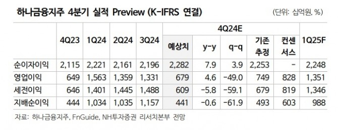 이미지 확대보기정준섭 NH투자증권 연구원은 "하나즘융지주의 지난해 4분기 지배순이익은 4410억원으로 컨센서스를 하회할 것으로 예상한다"며 "환율 급등에 따른 환평가손과 프로젝트파이낸싱(PF) 관련 충당금 적립 영향을 받을 것"이라고 분석했다.