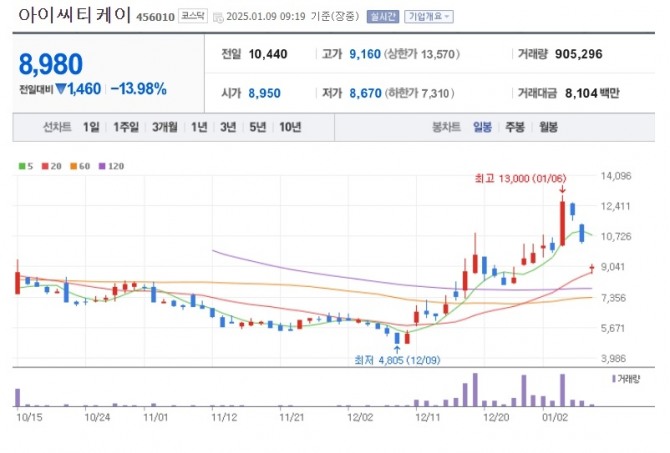 9일 한국거래소에 따르면 오전 9시19분 현재 아이씨티케이가 13.98% 하락하고 있다.