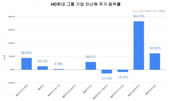 반면, HD현대그룹의 시가총액은 1년 새 40조원 넘게 증가했다. HD현대그룹 상장 계열사의 시가총액은 2023년 말 34조3149억원에서 지난해 말 76조8401억원으로 조42조5251억원(123.93%) 증가했다. 대기업 집단 중 유일하게 배 이상 증가했다. 시총 순위도 2023년 말 10위에서 2024년 말 5위로 올라섰다.