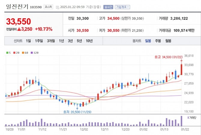 이미지 확대보기22일 한국거래소에 따르면 일진전기는 오전 9시59분 유가증권 시장에서 전날보다 10.73% 오른 3만3550원에 거래중이다. 특히 장 초반 주가가 3만4500원까지 상승하며 역대 최고가를 찍었다.