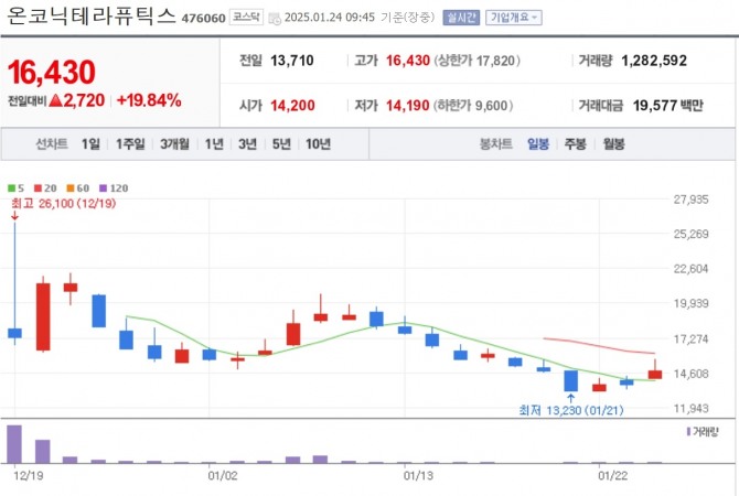 이미지 확대보기24일 한국거래소에 따르면 오전 9시45분 기준 전일 대비 19.84% 오른 1만6430원에 거래 중이다.