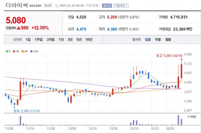 이미지 확대보기10일 한국거래소에 따르면 오전 9시40분 기준 디아이씨는 전 거래일 대비 12.39% 오른 5080원에 거래되고 있다.