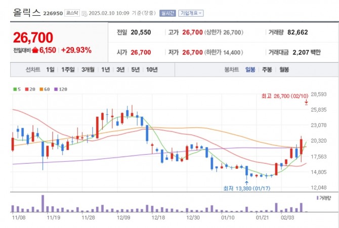 이미지 확대보기10일 한국거래소에 따르면 이날 오전 10시 09분 기준 올릭스는 전 거래일 대비 29.93% 급등한 2만6700원을 기록 중이다.