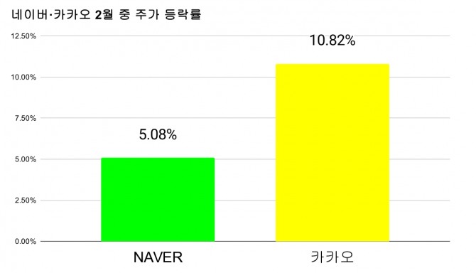 10일 한국거래소에 따르면 2월 들어 네이버와 카카오는 각각 5.08%, 10.82% 올랐다.