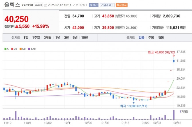 이미지 확대보기12일 오전 10시11분 기준 코스닥 시장에서 올릭스는 전일 대비 15.99% 오른 4만250원에 거래되고 있다. 지난 7일부터 이날까지 주가는 연일 오름세를 보이며 4거래일 동안 106%대 올랐다.