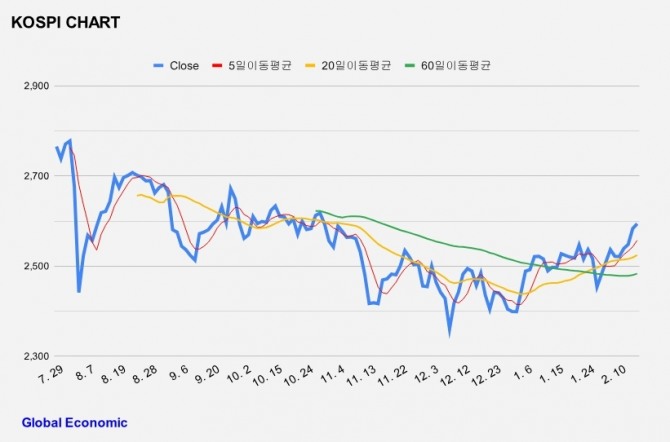이미지 확대보기이날 한국거래소에 따르면, 오전 9시 5분 현재 코스피는 전 거래일 보다 0.41%(10.71포인트) 오른 2593.88을 기록하고 있다.