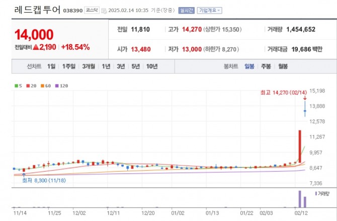이미지 확대보기14일 한국거래소에 따르면 이날 오전 10시34분 기준 레드캡투어는 전 거래일 대비 18.54% 오른 1만4000원에 거래되고 있다. 장중 한때 1만4270원을 찍으며 52주 신고가도 기록했다. 레드캡투어는 전날에도 상한가까지 올랐다.