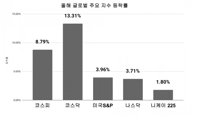 같은 기간 미국 S&P500은 3.96%, 나스닥 지수는 3.71% 오르는데 그쳤다. 닛케이225지수와 상해종합지수는 마이너스 수익률을 기록했다.