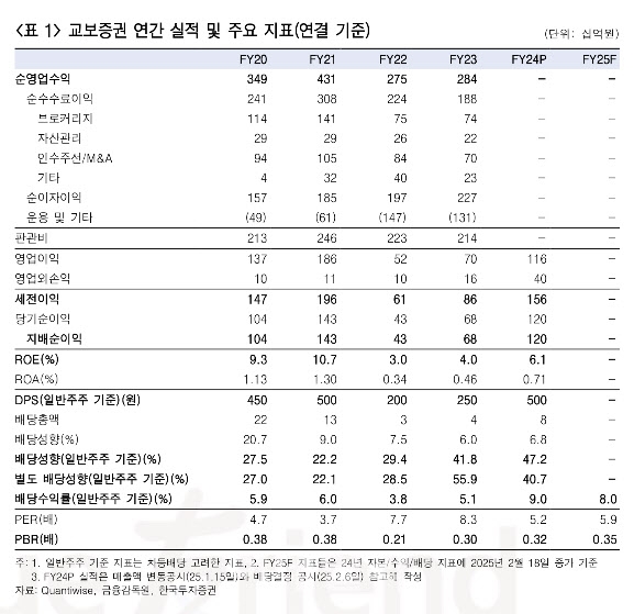 교보증권은 별도 및 일반주주 기준 배당성향으로 소통 중인데 2024년 배당성향이 40.7%를 기록했다. 20%대였던 성항은 2023년 이래 40% 이상을 유지되고 있다. 올해는 프로젝트파이낸싱(PF) 충당금만 축소돼도 증익이기에 배당성향 유지 시 DPS 추가 확대가 예상된다고 평가했다.