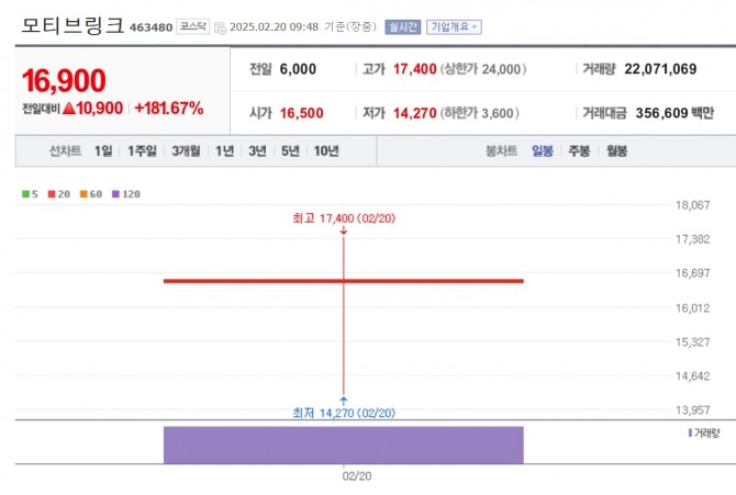 이미지 확대보기20일 한국거래소에 따르면 이날 오전 9시48분 현재 모티브링크는 공모가 6000원 대비 181.67% 오른 1만6900원에 거래되고 있다.