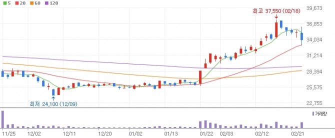 장중 최저가는 3만3050원(-2250원) 까지 급락 후 일부 하락폭을 만회한 상황이다.