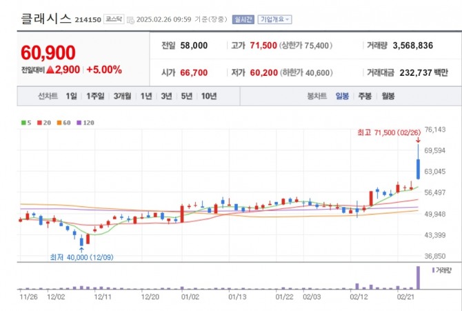 이미지 확대보기26일 한국거래소에 따르면 오전 9시 59분 기준 클래시스 주식은 코스닥 시장에서 5.00% 오른 6만900원에 거래중이다. 장중 한때 23.28% 오른 7만1500원까지 치솟으면서, 역대 최고가를 기록했다.