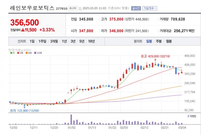 이미지 확대보기5일 한국거래소에 따르면 오전 11시03분 기준 레인보우로보틱스는 전일 대비 3.33% 오른 35만 6500원에 거래되고 있다. 장중에는 37만 5000원까지 오르기도 했다.