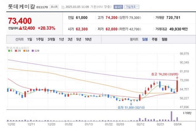 이미지 확대보기5일 한국거래소에 따르면 이날 롯데케미칼의 주가는 전 거래일 대비 18.03% 오른 7만2000원에 거래를 마감했다.