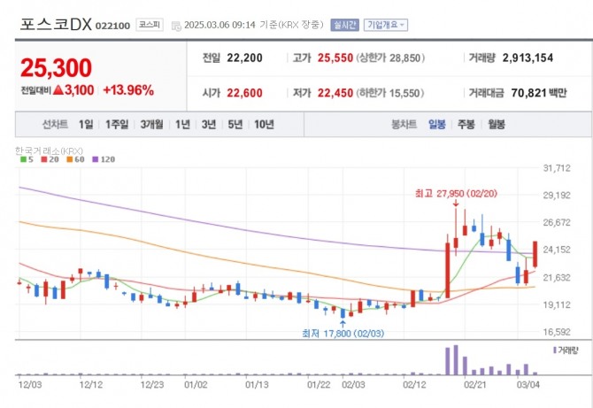 이미지 확대보기6일 한국거래소에 따르면 오전 9시 14분 현재 포스코DX는 전 거래일보다 13.96% 오른 2만 5300원에 거래되고 있다.