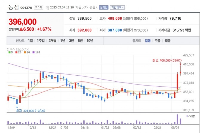 이미지 확대보기7일 한국거래소에 따르면 오전 11시 20분 기준 농심의 주가는 전장 대비 1.67% 오른 39만6000원에 거래되고 있다. 농심의 주가가 40만원을 돌파한 것은 장중 기준으로 9월 말 이후 처음이다.