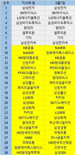이미지 확대보기9일 한국거래소에 따르면 시총 상위 1~30위 중 지난해 말 대비 자리를 지키고 있는 종목은 8개로 집계됐다. 상위 1~8위까진 변동이 없고 9위~30위는 모두 순위가 바뀌었다.