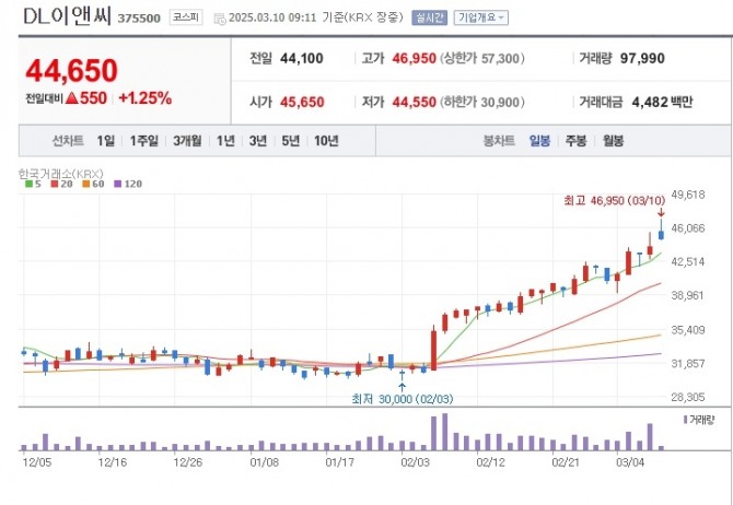 이미지 확대보기10일 한국거래소에 따르면 이날 오전 9시11분 현재 DL이앤씨는 전거래일 대비 1.25% 오른 4만4650원에 거래 중이다.