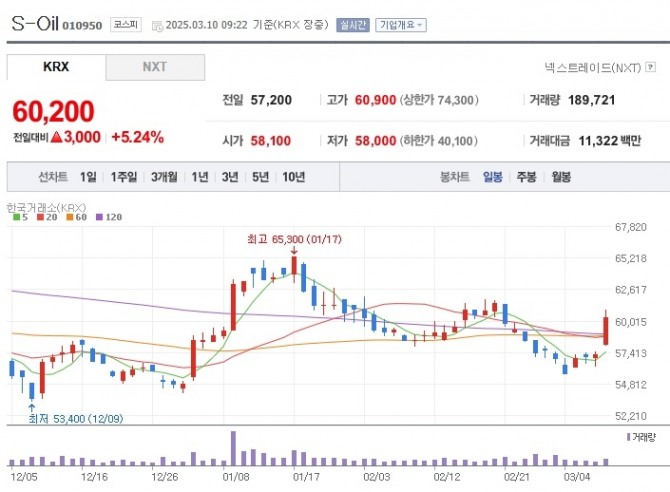 이미지 확대보기10일 한국거래소에 따르면 이날 오전 9시22분 현재 S-Oil은 전거래일 대비 5.24% 오른 6만 200원에 거래 중이다.