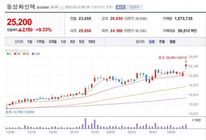 이미지 확대보기12일 한국거래소에 따르면 오전 9시34분 현재 동성화인텍은 전 거래일보다 9.33% 오른 2만 5200원에 거래되고 있다. 장중 2만 6050원까지 치솟아 52주 신고가를 경신했다.