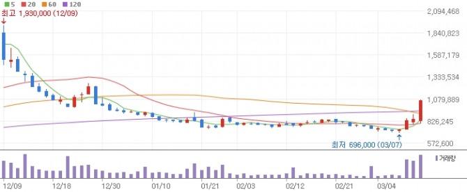 기관투자가가 150억원어치를 사들이며 상승세를 주도했다. 그러면서 지난해 12월 말 후 두 달 만의 100만원대를 회복했다.