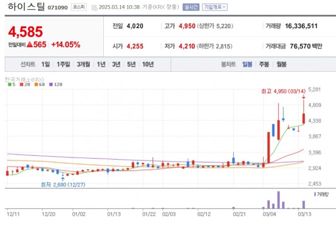 14일 한국거래소에 따르면, 이날 유가증권시장에서 오전 10시38분 기준 하이스틸 주가는 전날에 비해 14.05% 오른 4585원을 기록했다.
