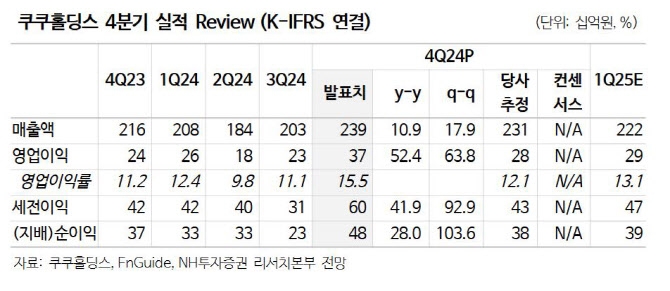 이승영 NH투자증권 연구원에 따르면, 쿠쿠홀딩스는 4분기 연결기준으로 매출액 2393억원을 기록하며 전년 대비 11% 증가했다. 영업이익은 370억원으로 전년보다 52% 증가하여 예상치를 상회했다. 특히, 광고비가 증가했음에도 불구하고 고수익성 제품 판매 비중이 확대되면서 양호한 수익성을 기록한 것으로 분석됐다.