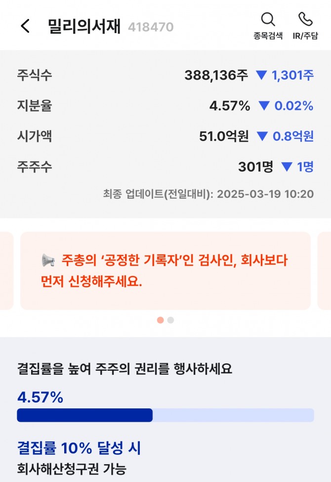 이미지 확대보기밀리의서재 소액주주들이 주주총회를 앞두고 주주환원 정책을 제공하라고 공식요구했다.