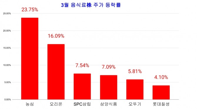 이번달 들어서는 농심이 23.75% 오르며 가장 높은 수익률을 기록했다. 그외 오리온(16.09%), SPC삼립(7.54%), 삼양식품(7.09%), 오뚜기(5.81%), 롯데칠성(4.10%) 등 일제히 상승세를 나타내고 있다.