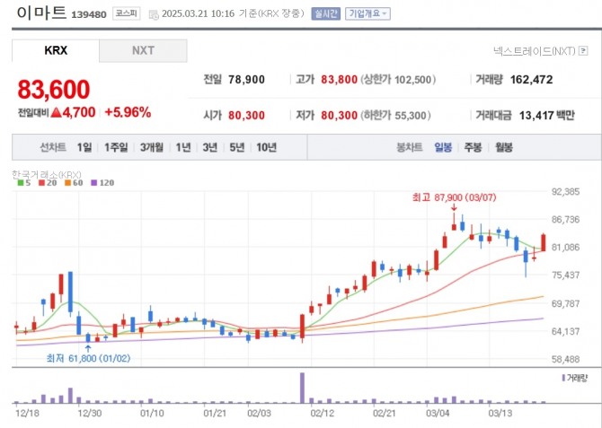 이미지 확대보기21일 한국거래소에 따르면 오전 9시 16분 현재 이마트는 전 거래일보다 5.96% 오른 8만 3600원에 거래되고 있다.