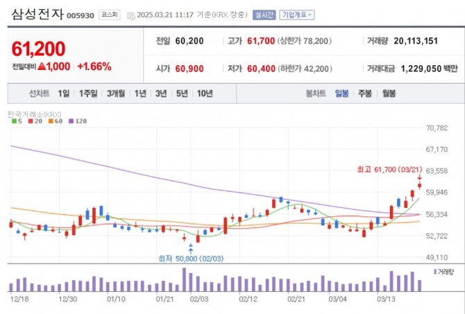 이미지 확대보기21일 한국거래소에 따르면 삼성전자는 오전 11시 17분 전일 대비 1.66% 오른 6만1200원에 거래중이다.