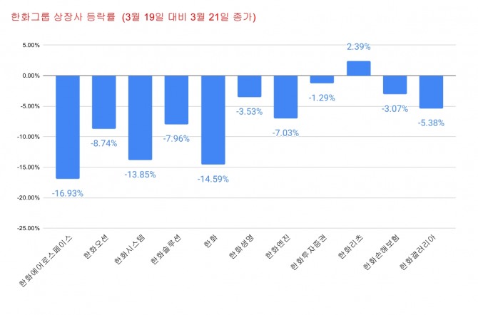 다음은 21일 종가 기준 한화그룹 계열사의 보통주 등락률이다.