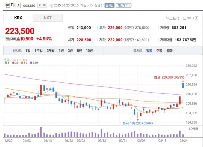 이미지 확대보기25일 한국거래소에 따르면 오전 9시 16분 현재 현대차는 전 거래일 대비 4.93% 오른 22만 3500원에 거래되고 있다. 기아는 3.34% 오른 10만 2000원에 거래 중이다.