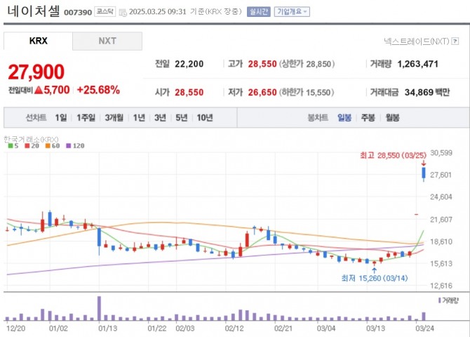 이미지 확대보기장이 열리자마자 네이처셀 주식이 2만8550원에 매매 체결이 이뤄지면서 최근 1년 중 최고가를 찍었다. 네이처셀은 전날에 상한가(일일 가격 제한폭)로 거래를 마쳤다.