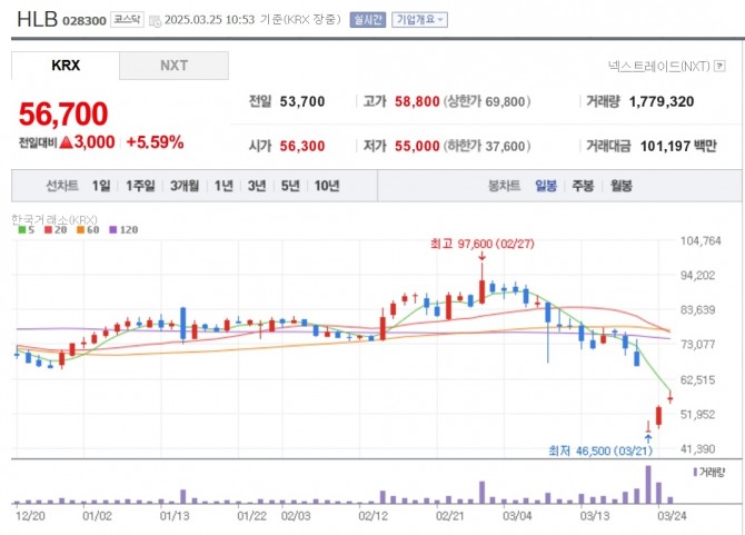 이미지 확대보기25일 한국거래소에 따르면 오전 10시 53분 현재 HLB는 전 거래일 대비 5.59% 오른 5만6700원에 거래되고 있다.