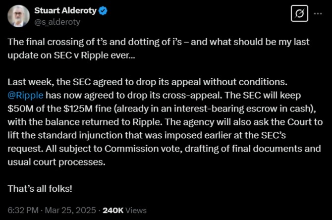 이미지 확대보기스튜어트 알데로티(Stuart Alderoty) 리플 최고법률책임자(CLO)는 25일(현지시각) 자신의 X(구 트위터)를 통해 이와 같이 전하며 "법원이 리플에 부과한 1억2500만 달러 규모의 과징금 중 5000만 달러는 SEC가 보관하며, 나머지는 리플에 반환될 예정이다"라고 설명했다.