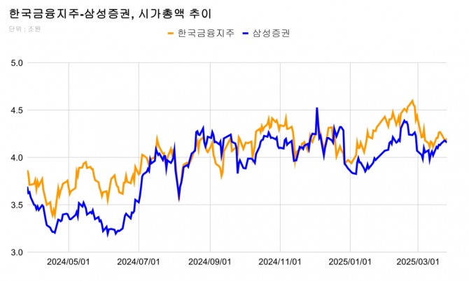 한국금융지주는 지난해 12월 30일 삼성증권을 제치고 3위로 올라섰으며, 지난달 24일에는 삼성증권에 비해 3600억원 이상 시가총액이 앞섰지만 이달 들어 5.4% 하락하면서 격차가 좁혀진 상황이다.
