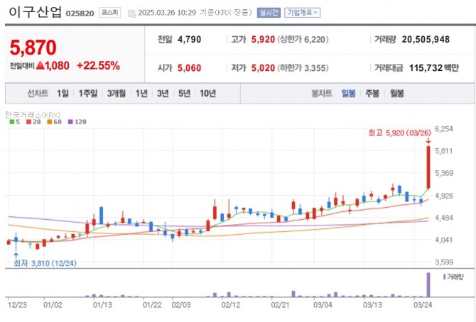 이미지 확대보기26일 한국거래소에 따르면,구리 관련주로 꼽히는 이날 오후 2시50분 현재 이구산업은 전날보다 22.76%(1090원) 오른 5880원에 거래되고 있다. 대원전선은 5.53%, 서원 4.88%, 풍산 6.30% LS 1.59%의 상승률을 기록했다.