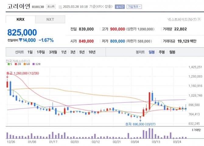이날 한국거래소에 따르면 이날 오전 10시 18분 현재 고려아연 주가는 전일 대비 1.67% 내린 82만5000원에 거래되고 있다. 고려아연 주가는 84만9000원에 거래를 시작해 장중 90만원까지 오르는 등 롤러코스터 행보를 보이고 있다.