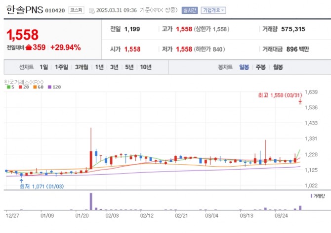 이미지 확대보기31일 한국거래소에 따르면 오전 9시 36분 현재 한솔PNS는 전 거래일보다 29.94% 오른 1558원에 거래되고 있다.