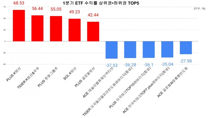 한편 이 기간 수익률 2~5위도 방산 관련 ETF가 나란히 상위권을 휩쓸었다. △2위 미래에셋자산운용 'TIGER K방산&우주'(56.44%) △3위 'PLUS 한화그룹주'(55.05%) △4위 신한자산운용 'SOL K방산'(49.23%) △5위 'PLUS 글로벌방산'(42.44%) 순이다.