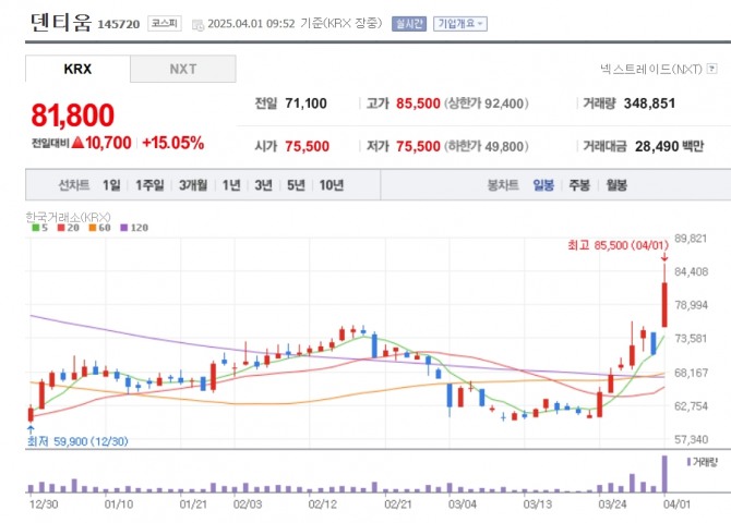 이미지 확대보기1일 한국거래소에 따르면 오전 9시 52분 기준 덴티움은 전장 대비 15.05% 오른 8만1800원에 거래되고 있다.